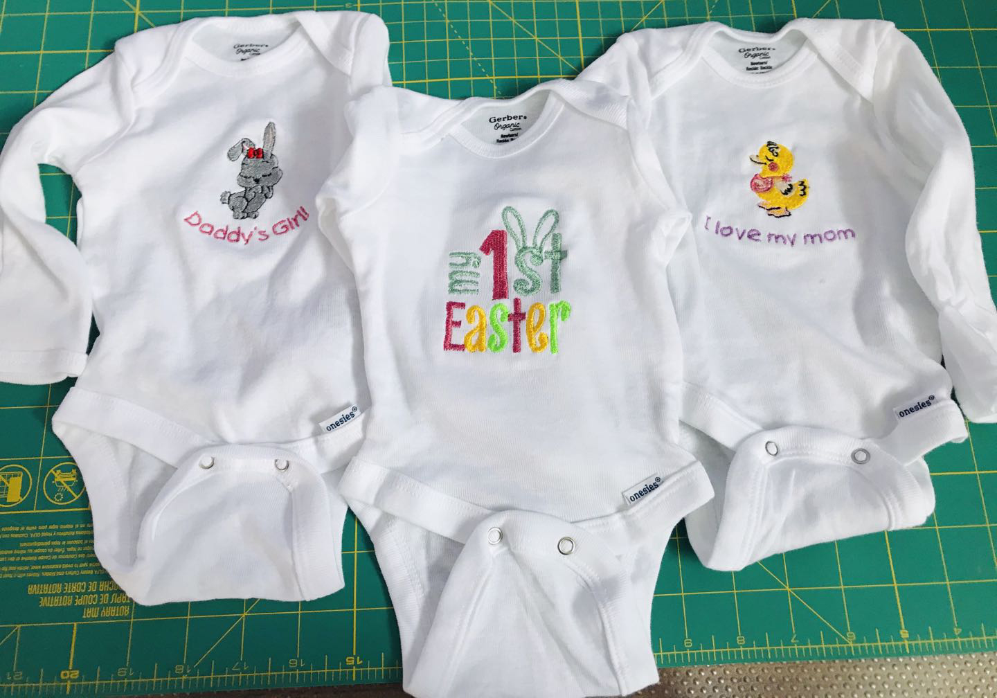 Currently we have a small set of examples of embroidered baby clothes. We can add embroidery to almost any clothes. The onesies pictured are $30 each. They will be less if the customer provides the clothing. Large or very complex patterns may cost more. Please contact us with questions or for more detailed pricing..